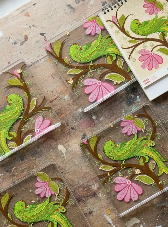 “Sắp xếp các mảnh lịch vào khuôn silicone nông (tròn hoặc vuông khoảng 10cm), trộn nhựa epoxy hai thành phần theo hướng dẫn và đổ một lớp mỏng lên trên” – Puneet Gupta gợi ý – “Dùng máy sấy tóc hoặc đèn khò để loại bỏ bọt khí, để khô 24 giờ, rồi đổ thêm lớp thứ hai dày hơn để tạo độ sâu. Nhựa sẽ bao bọc giấy hoàn toàn, tạo bề mặt giống thủy tinh, bóng và chống thấm nước”.