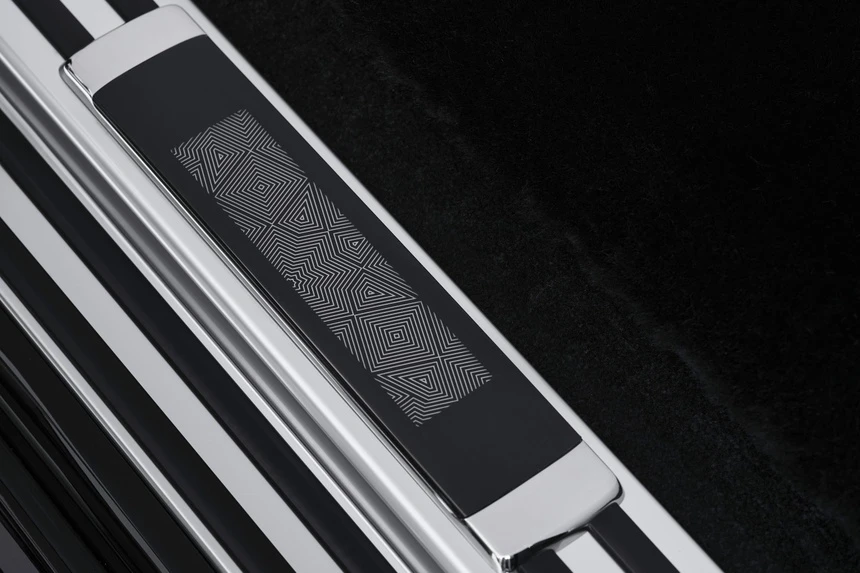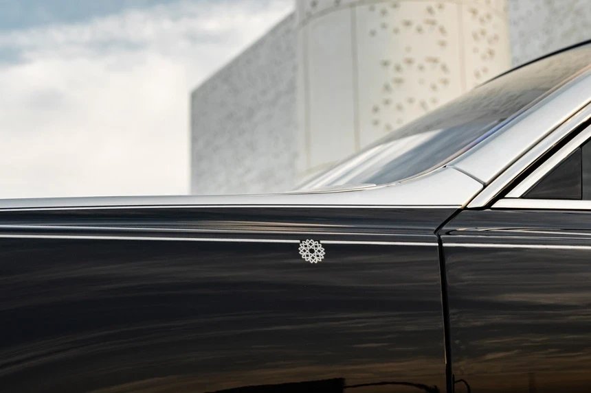 Ngoại thất của chiếc xe được phủ lớp sơn bespoke đen Diamond Black với phần thân trên màu bạc. Đường Coachline và họa tiết Mashrabiya cũng có tông màu tương phản.