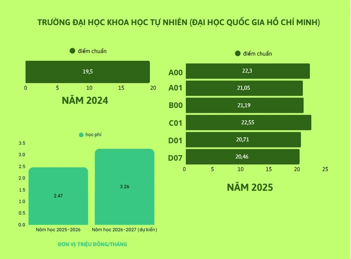 Trong khi đó, mức học phí năm học 2025-2026 cho ngành này là 7,6 triệu đồng/kỳ, tương đương 15,2 triệu đồng/năm. Điểm chuẩn năm 2024 và 2025 đều là 15 điểm theo kết quả điểm thi trung học phổ thông với tổ hợp xét tuyển là A00; A01; A02; B00.