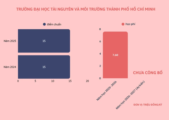 Theo thông tin tuyển sinh hệ đại học chính quy năm 2026, Trường Đại học Tài nguyên và Môi trường Thành phố Hồ Chí Minh xét tuyển ngành Địa chất học (thuộc lĩnh vực Khoa học Trái Đất) theo 6 phương thức. Tuy nhiên, nhà trường chưa công bố về tổ hợp xét tuyển, mức học phí dự kiến năm nay.
