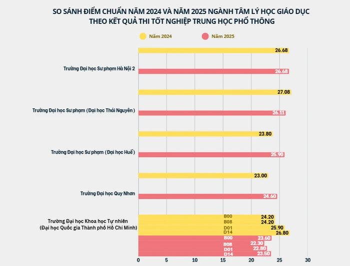 Năm 2025, điểm chuẩn trúng tuyển Trường Đại học Sư phạm (Đại học Thái Nguyên) đối với ngành Tâm lý học giáo dục là 26,11 điểm, trong khi năm 2024 là 27,08 điểm.