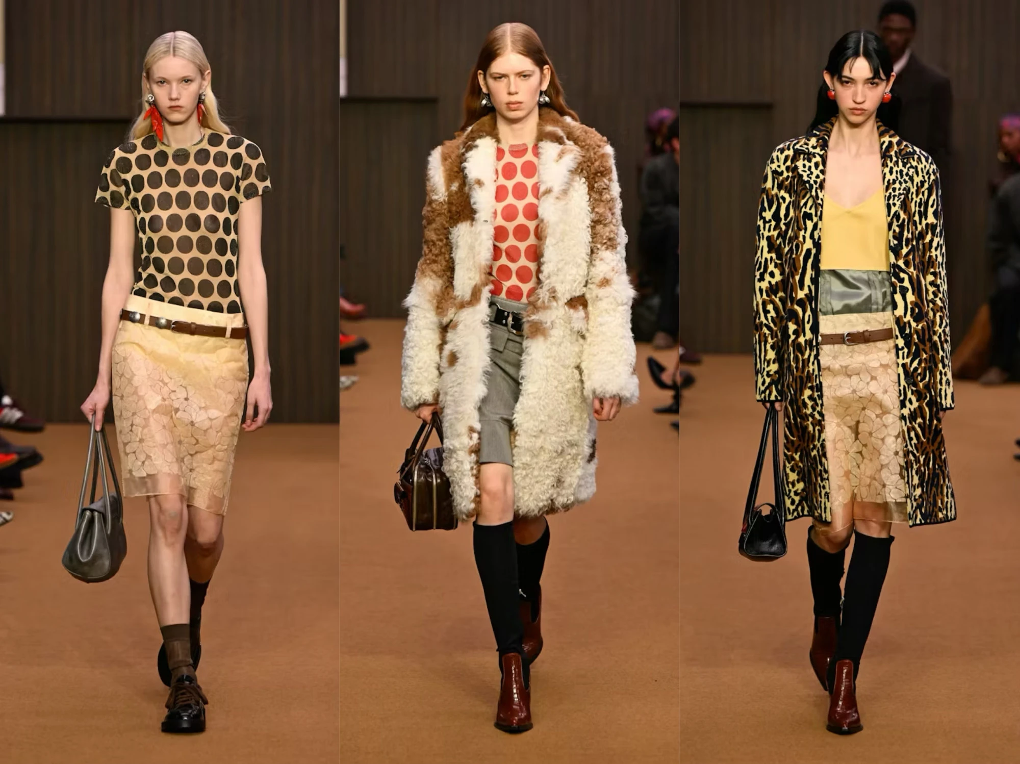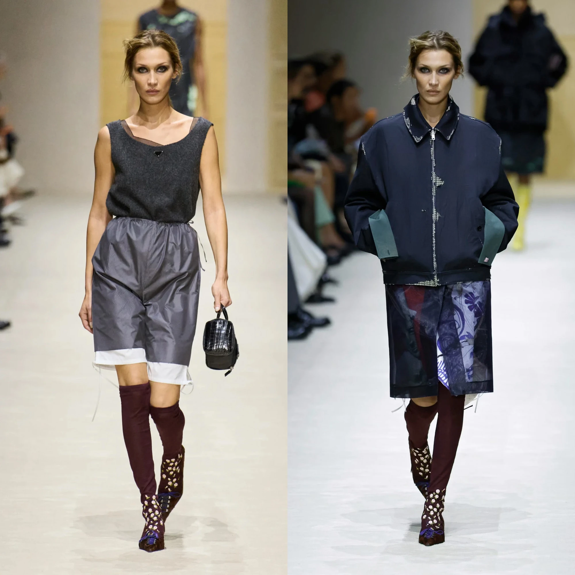 Một trong những khoảnh khắc nổi bật là sự xuất hiện của Bella Hadid trong nhiều lượt trình diễn, mỗi lần cởi bớt một lớp trang phục để lộ những biến thể khác nhau của một tổng thể, như một minh chứng trực quan cho ý tưởng “mặc nhiều hơn một trang phục trong cùng một lúc” mà Prada hướng tới.