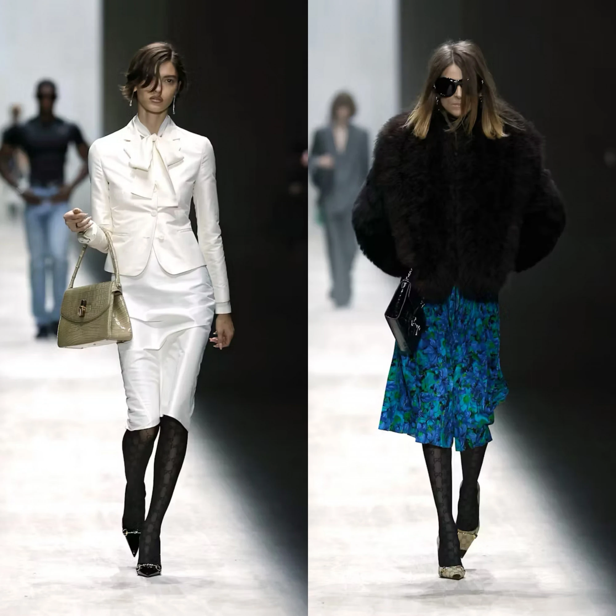 Bộ sưu tập còn tạo ấn tượng với cách biến hóa phom dáng từ cổ điển đến hiện đại, đưa Gucci trở lại với vị thế vừa xa xỉ vừa có tính ứng dụng. Màu đen là gam màu chủ đạo được phối hợp với bề mặt satin và chiffon tạo nên hiệu ứng thị giác quyến rũ và đầy chiều sâu.
