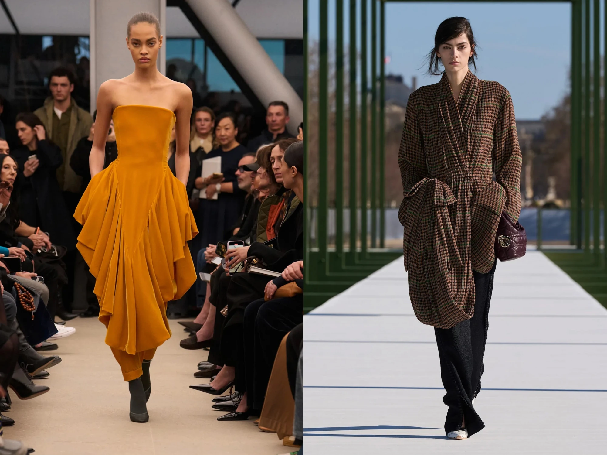 Một trong những xu hướng nổi bật nhất trên các sàn diễn năm nay là sự trở lại của phom dáng tôn vòng eo, đặc biệt là thiết kế basque waist – kiểu eo chữ V kéo dài xuống dưới hông. Xu hướng này xuất hiện trong nhiều bộ sưu tập của các thương hiệu như Jacquemus, Saint Laurent, Alaïa và Dior, với các phiên bản corset hoặc phom váy điêu khắc mang tính kiến trúc.