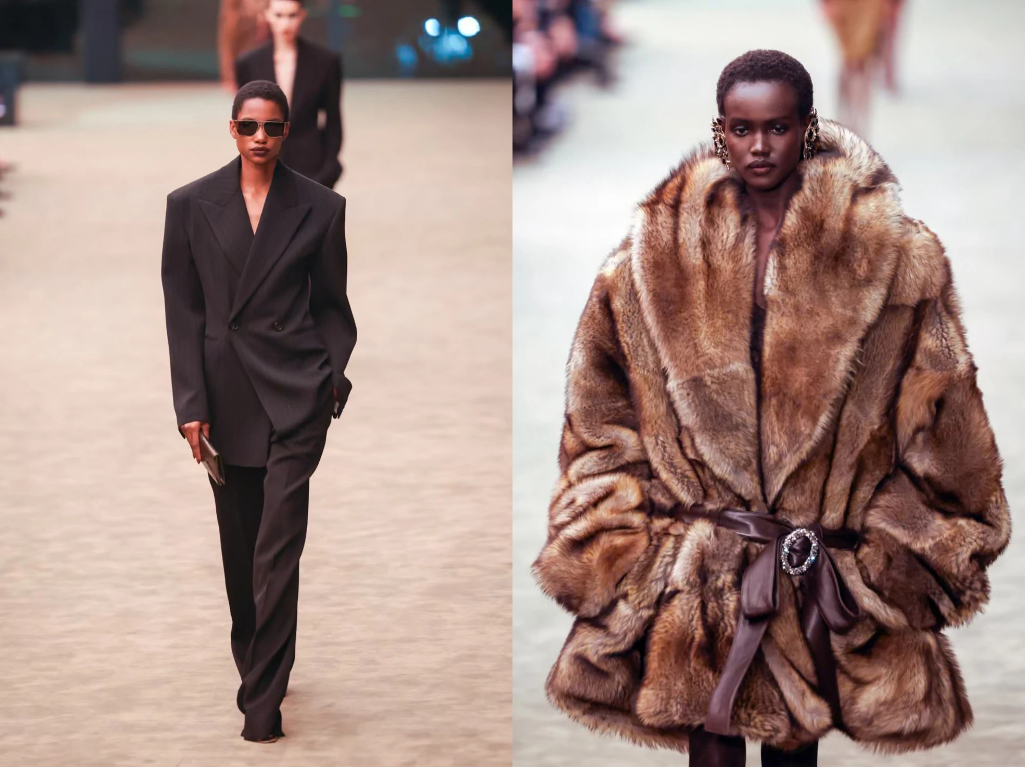 Xu hướng power dressing – phong cách trang phục quyền lực cũng trở lại rõ rệt trong mùa mốt 2026. Nhà mốt Yves Saint Laurent gây chú ý khi hồi sinh bộ suit biểu tượng Le Smoking, vốn từng làm nên cuộc cách mạng thời trang nữ vào thập niên 1960. Phiên bản mới mang hơi hướng thập niên 1980 với áo khoác vai rộng, trang sức lớn và áo khoác shearling oversized.
